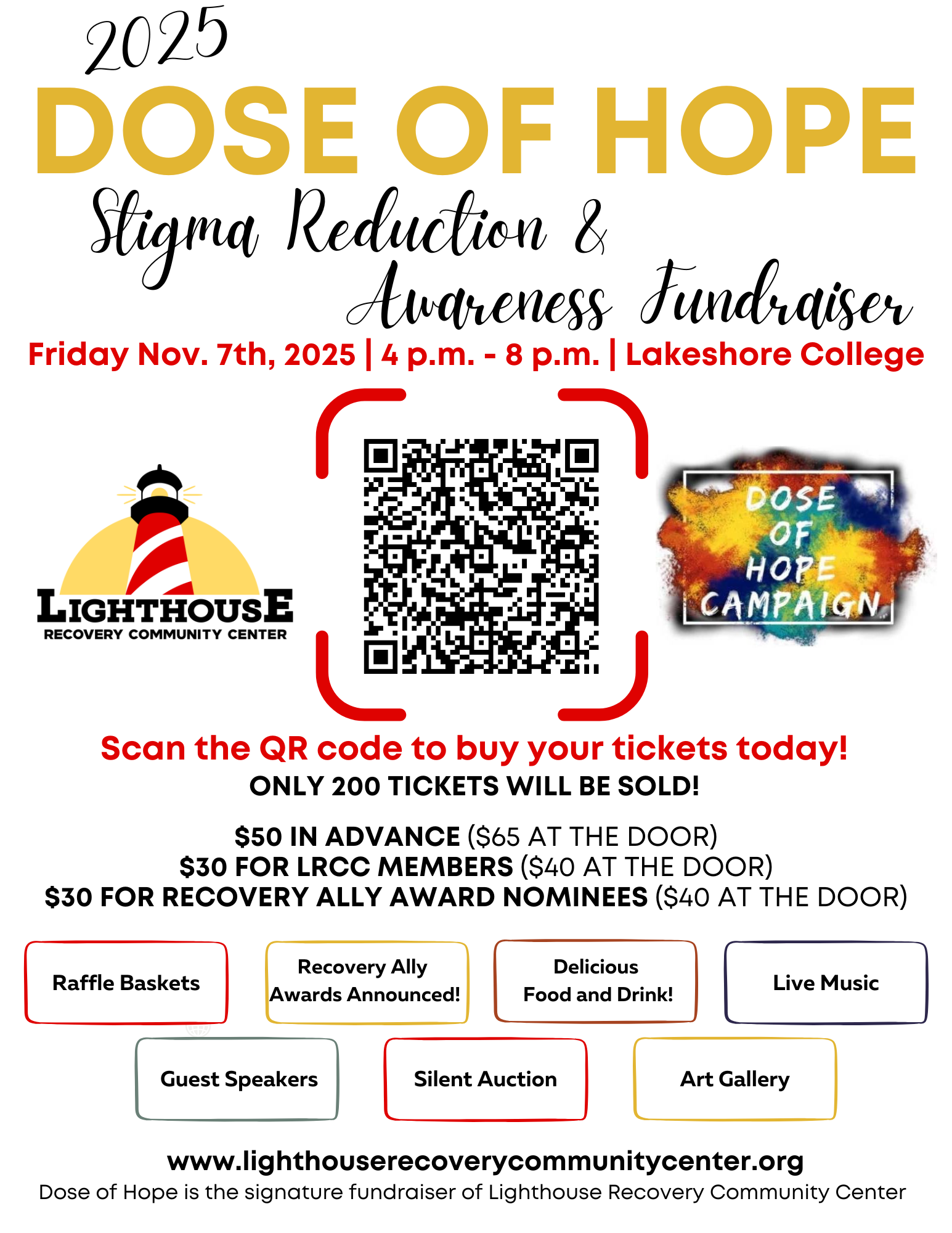 The Dose of Hope event educates the community about Lighthouse's mission, services, and the population it serves while providing critical financial support. The evening features raffle baskets, guest speakers, live music, a silent auction, delicious food and drink, an art gallery, and the announcement of the Recovery Ally Awards. The art gallery will showcase quality pieces from peers at Lighthouse, community members, and local artists.