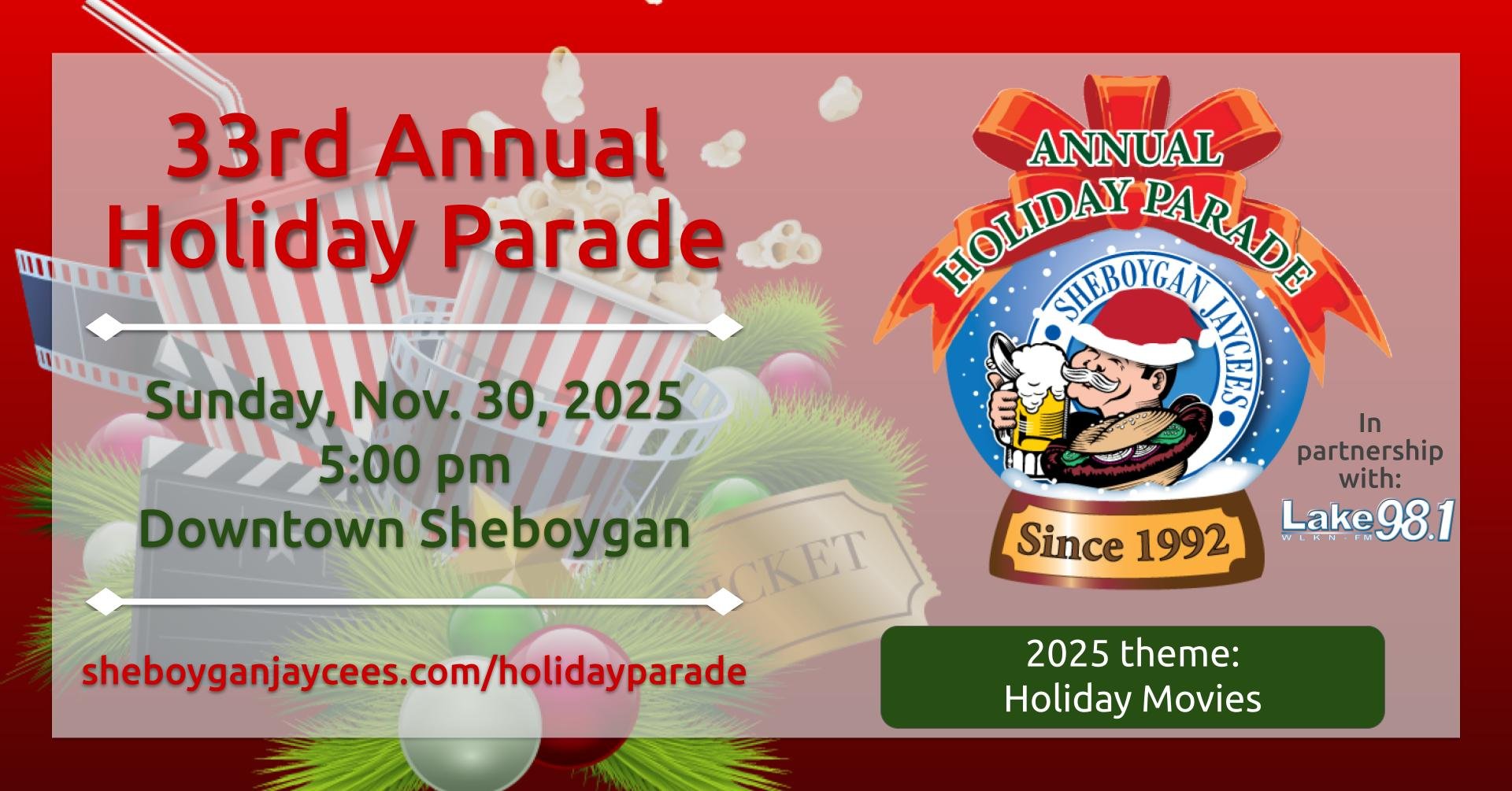 Promote your organization or business and show your holiday spirit by participating in the Holiday Parade! You can enter a decorated float, have your employees wear holiday costumes and distribute candy, or come up with your own creative entry. Access the entry form at www.sheboyganjaycees.com/holidayparade, deadline is Nov. 21.